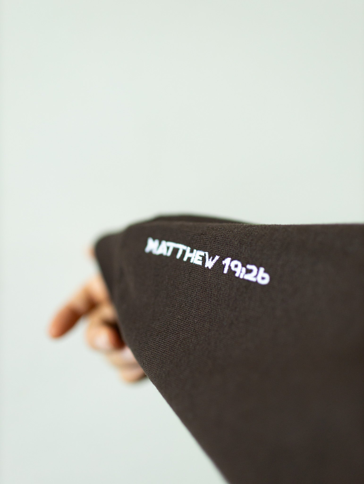 On the right wrist is delicately embroidered "Matthew 19:26" which is "With God all things are possible". And hidden in the tag is a personal private note of encouragement saying "This is hard, but you can do hard things."